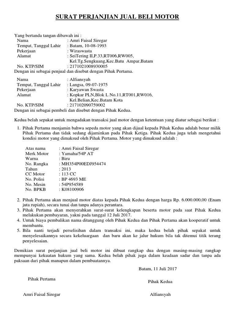 Savesave surat perjanjian jual beli motosikal for later. Contoh surat perjanjian jual beli motor kredit. Namun untuk jual beli harta atau barang tertentu, dibutuhkan surat perjanjian antara kedua belah. Pembuka surat juga bisa menjelaskan barang atau hal apa yang diperjual belikan. Semoga informasi ini bisa bermanfaat dan berguna bagi anda semua. Contohnya adalah pada proses jual beli tanah. Adapun isi dari surat jual beli motor bisa dibilang cukup lengkap, karena seluruh informasi terkait identitas pemilik, penjual, pembeli serta detail motor akan dapat kita temukan. Demikianlah ulasan informasi seputar contoh surat perjanjian jual beli yang bisa kami berikan kepada anda semua, baca juga informasi tentang contoh surat pengunduran diri yang kami bahas dikesempatan sebelumnya. Selain itu, orang yang membuat surat ini juga harus memastikan bahwa tidak ada kesalahan penulisan identitas diri dan tanggal dilakukan transaksi tersebut. #vitron gais kita kena jaga diri dan keluarga ya. Dan ketika anda ingin memiliki barang atau harta tertentu, anda tinggal membelinya dengan menggunakan uang. Surat perjanjian jual beli merupakan sebuah surat yang dibuat oleh seorang penjual dan pembeli untuk menjelaskan hak dan kewajiban yang tidak boleh dilanggar oleh kedua belah pihak dalam suatu urusan jual beli. Ditambah lagi tidak banyak sumber contoh surat jual beli tanah yang ada baik di internet maupun yang dapat dibeli.